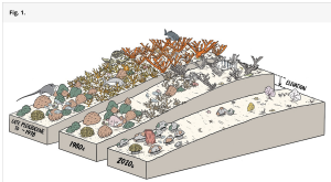 Recent changes in reef zonation of western Atlantic coral reefs, brought about by lack of recruitment of elkhorn (orange), staghorn (yellow), and massive boulder corals. Without these key reef builders, the reefs have already measurably eroded. Image credit: Rashpal Dhilon. Adapted from ref. 6, which is licensed under CC BY 4.0.” (Fig 1 in PNAS paper)
