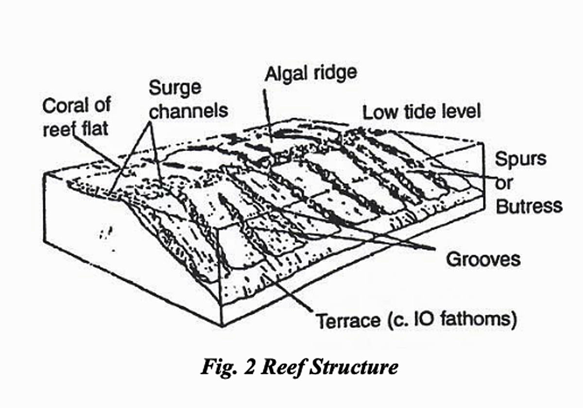 Most reefs have a spur and groove system which extends along the reef flat and some distance down the reef slope. This system is often extensively wide and long, depending on the reef slope. The spur and groove system appears to be formed by erosion reinforced by the prolific seaward growth of corals on the groove. The overall result of this spur and grove system is self-reinforcing. Incoming waves cause extensive surges along the groove resulting in the re-suspension of sediment and the continual movement of reef rubble prevents effective coral growth. Less turbulent waters experienced in the spur region allow coral growth which reduces turbulence further. In effect the spur and groove system of the reef structure acts primarily as a dissipator of the continual wave energy operating on the coastal shoreline. By dissipating wave energy before it reaches the shore the beach is protected from extensive wave action. |