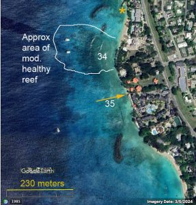 One such area is a large piece (about 2 ha) of the Vauxhall Reef (Reef #34 in the MPA) near Holetown, which I somewhat happenstanced upon in 2015 and have visited many times since. This reef was not amongst the 47 fringing reefs monitored every 5 years since 1997, and thus was not rated for reef health in the Coral Reef Report Cards for 2017 and 2022.