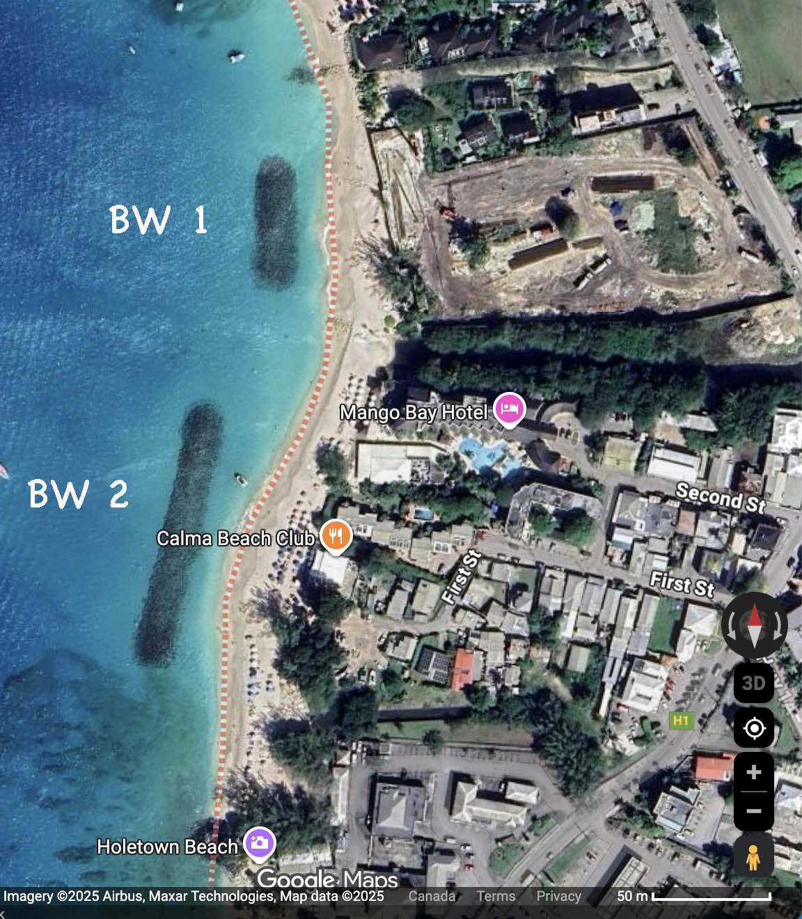 There are 2 breakwaters near to shore and parallel to shore in the area between Surfside and Discovery Bay, Holetown.