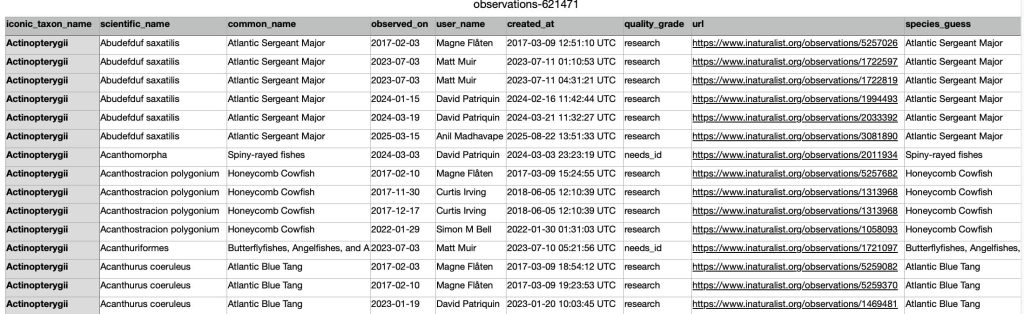 Then these data are given for each entry: – Observed on (date) – User Name (name of iNat user) – Created (date) – Quality Grade (Research or Needs ID) – URL- click on it to go to the entry on iNat – Species Guess |