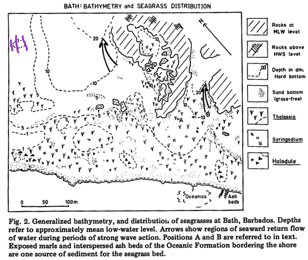 “In regions of strong seaward return flow of water (Fig. 2), currents reach speeds of 45 em/sec and greater. Waves over the seagrass bed are generally of the order of 30-60 em height at high water, and break over the entire seagrass bed area. During winter months when the east coast of Barbados is frequently subject to large swells, waves over the seagrass bed may reach heights of 1 m and greater, and longshore currents may reach speeds in excess of 60 em/sec.”