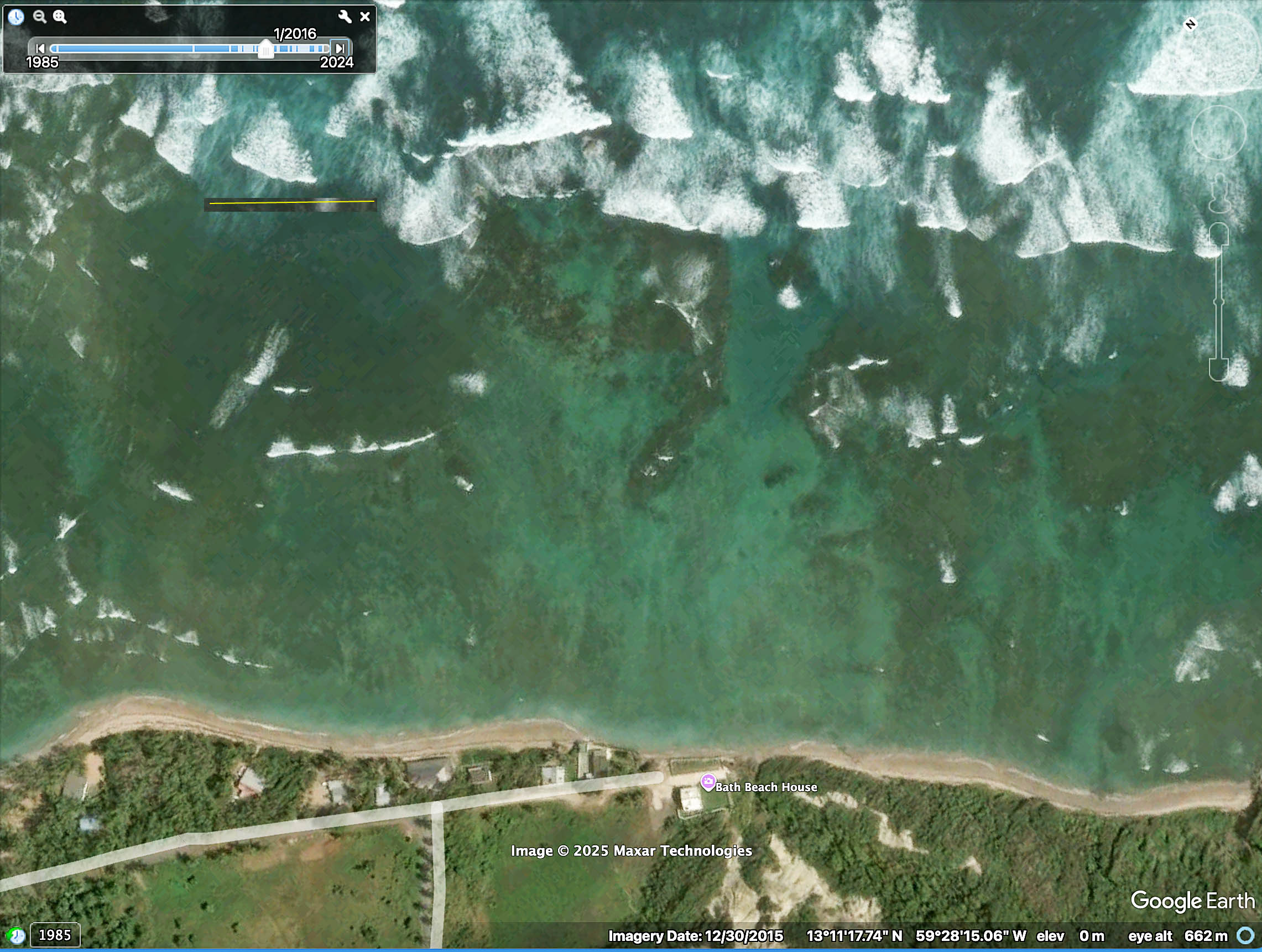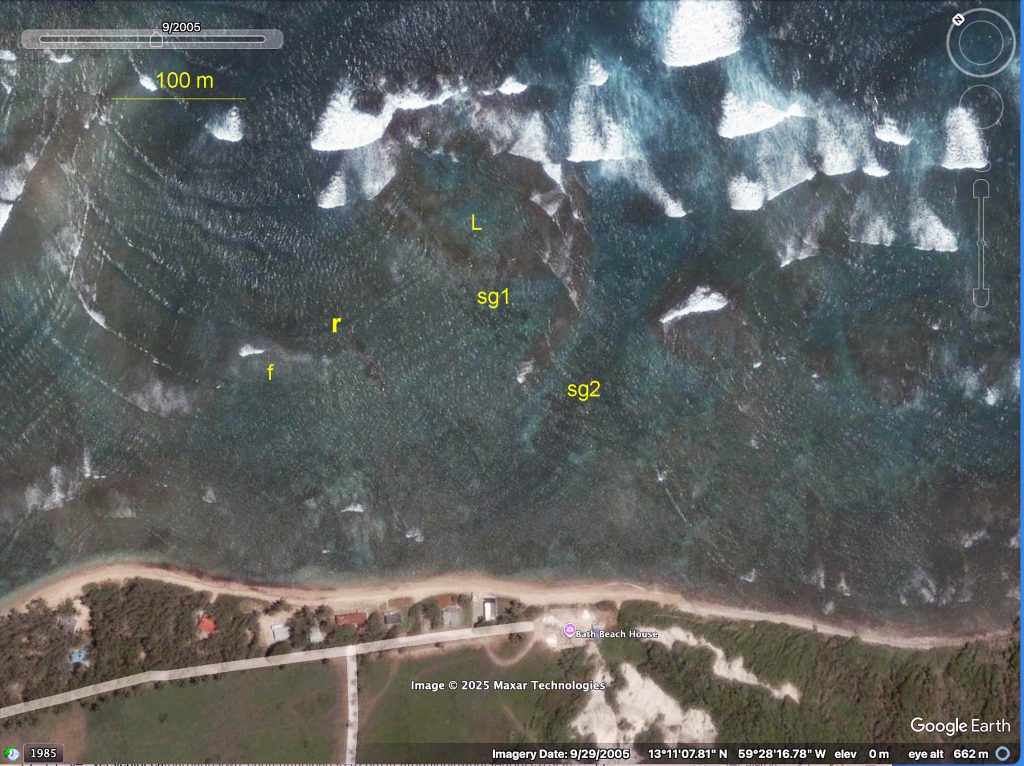 Img 4. 2005 Google Earth image with labels inserted. “r”: 3 rocks, can be seen in Maps above (Img 3 and Img 4); f: leading edge of seagrass bed, can be seen in Map 2; L: lagoon within “The Platform”; sg1: seagrass patch just leeward of Platform; sg2 distinct seagrass area, not present in 2015, 2022 Google Earth images.