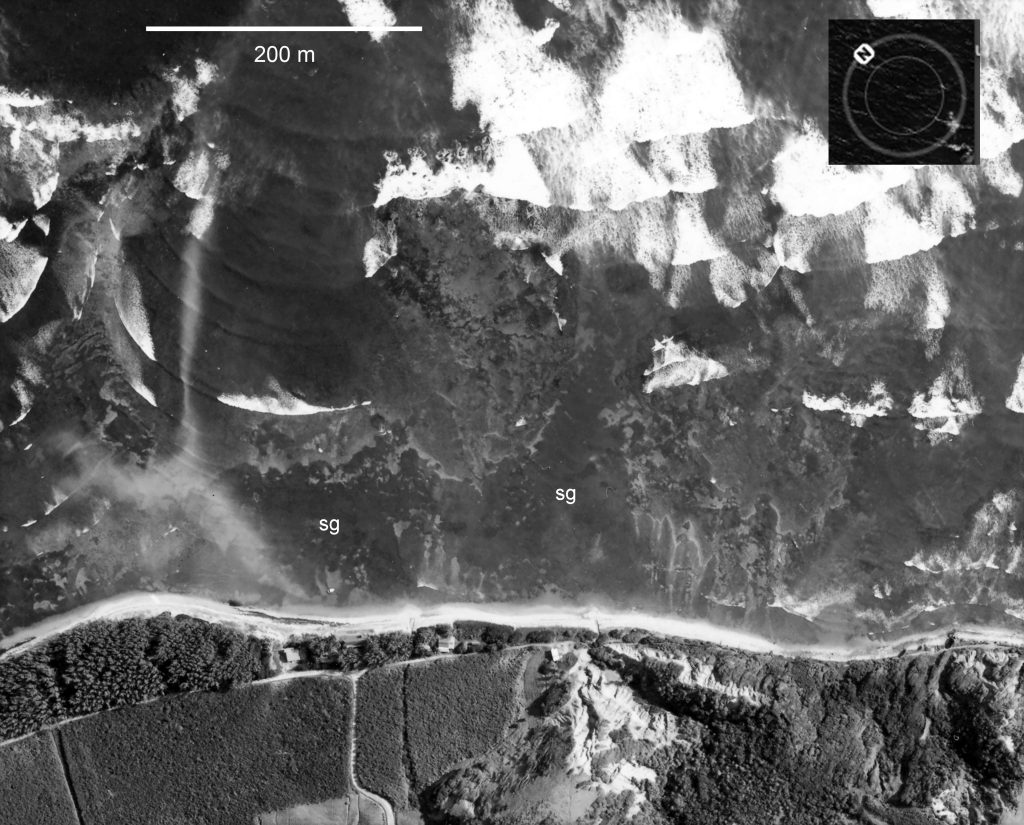 Img 2. Extract from 1964 aerial photo (HuntingSurveys Ltd.) showing Bath area, large sweeps of seagrass beds (sg). This image was used to prepare a base map of the area
