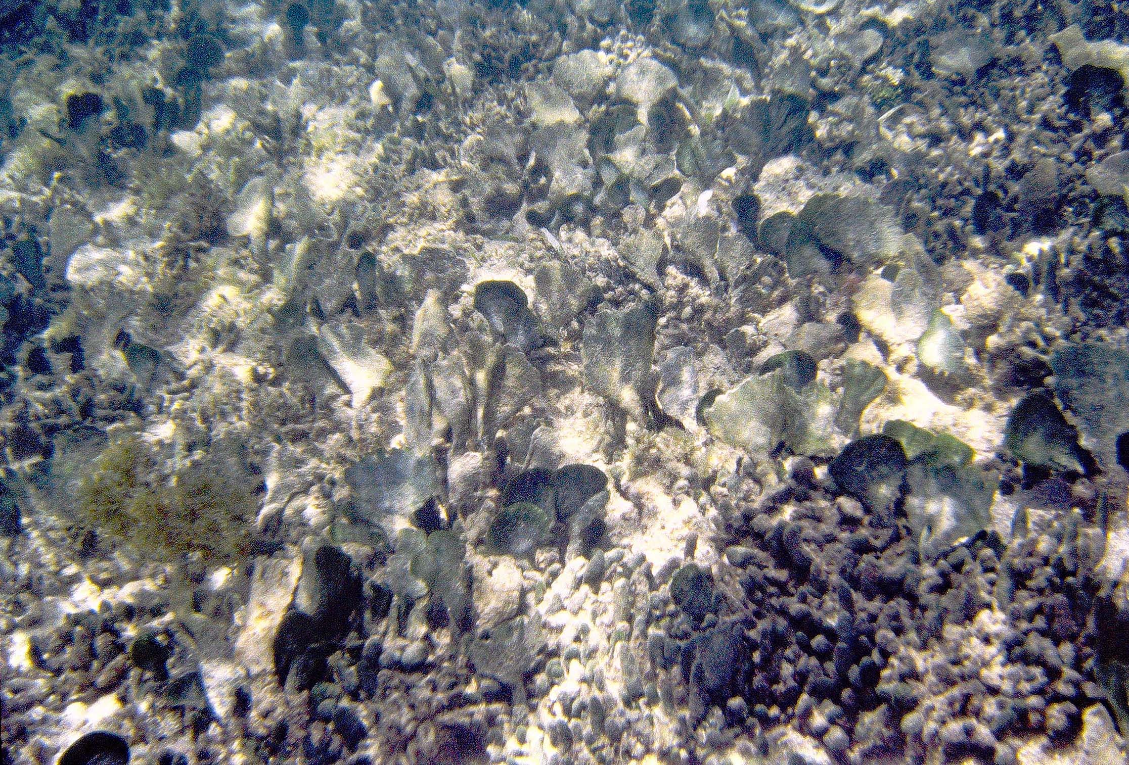 ![]() Pic 4. Erosional Scarp in mixed Thalassia-Syringodium stand (patch, area) on Cobble Framework or Cobble-Sand substrate, Note coarse rubble, including old rhodoliths on scarp face. |