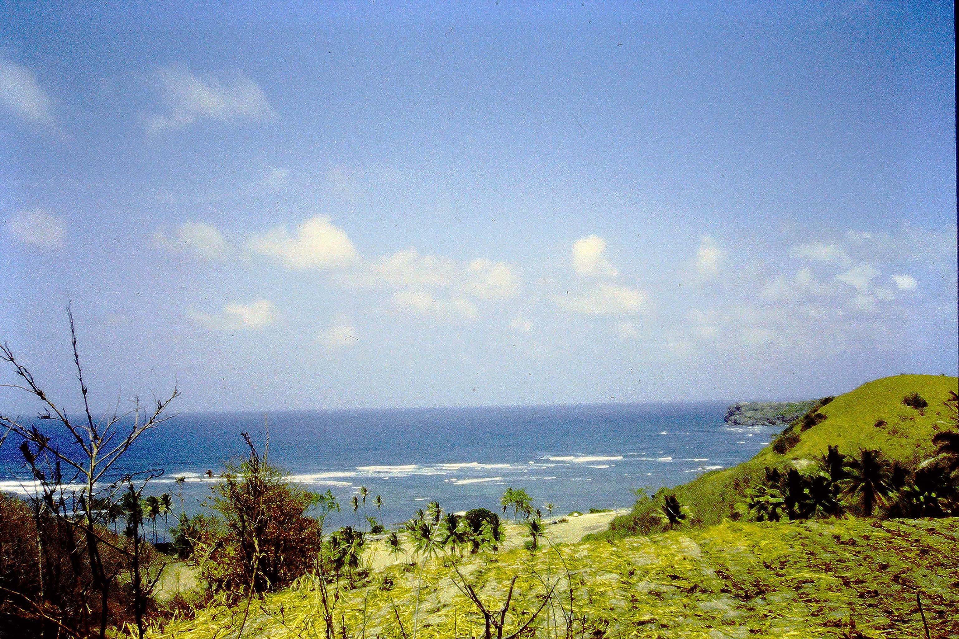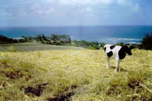 Holstein cow, waves break on rocks of “The Platform”. feeding on cane trash in field overlooking Bath. Just above the cow. Seagrass beds were concentrated in the area in the lee of The Platform. |