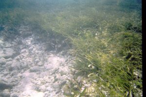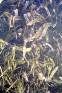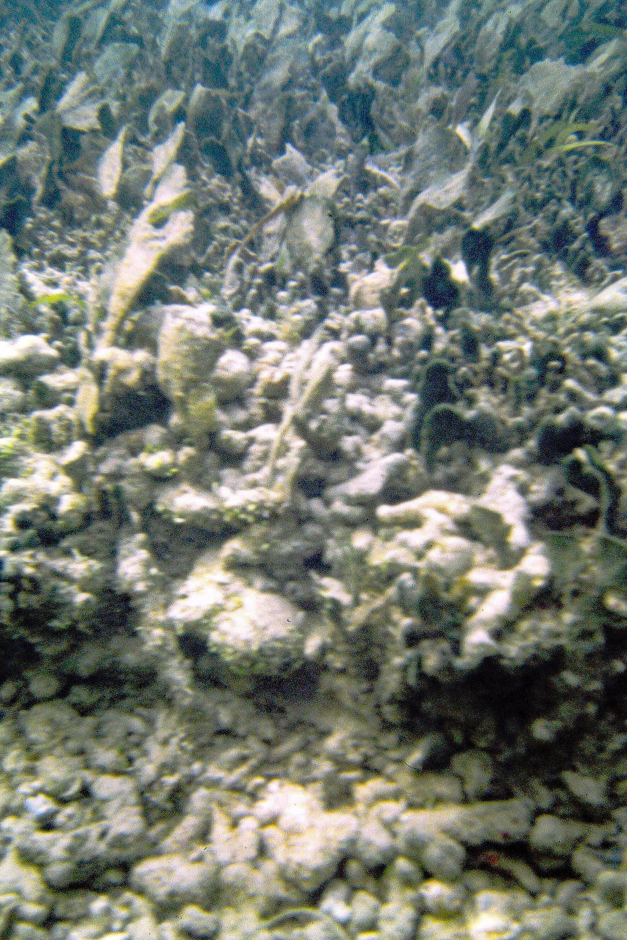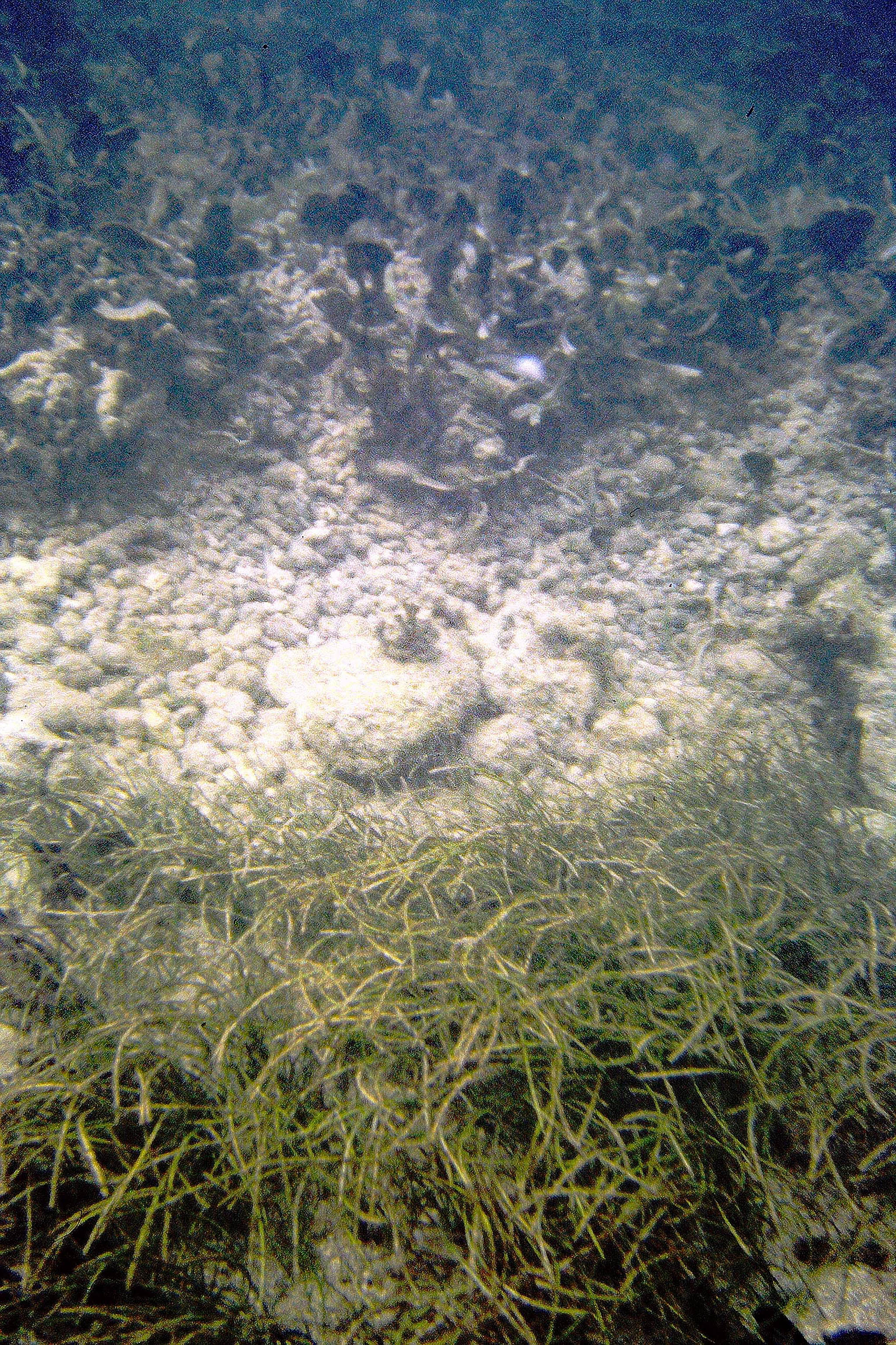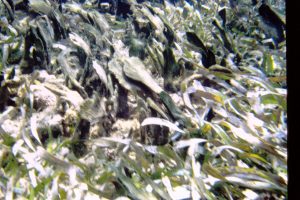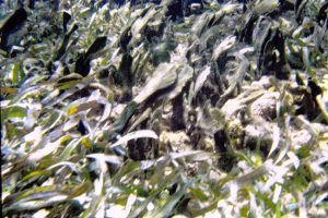 Patch of mixed Thalassia-Syringodium with excessive growth of flashy algal epiphytes; it was a fairly restricted area, ‘wondered at the time if it was related to upward movement of nutrient rich groundwater |
