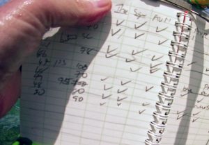 Working Map for Bath from 1969. “>X” refers to depths greater than X feet. Lines are transect lines. Green-highlighted numerals are the 28 random sampling points. Orange/yellow highlighted numerals are the 16 “Stations”, gree highlighted the 28 “Positions”. “M”: Main Transect. “S4A” – 4th transect towards the south from the M transect. Scales at bottom left in yards, meter scale inserted. “Canada began its transition to the metric system (SI) in 1970, with the process largely taking place netween 1975 and 1985. Key milestones included the introduction of Celsius in April 1975, followed by road signs and gasoline sales in the late 1970s, creating a hybrid system still used today” (From Google AI)