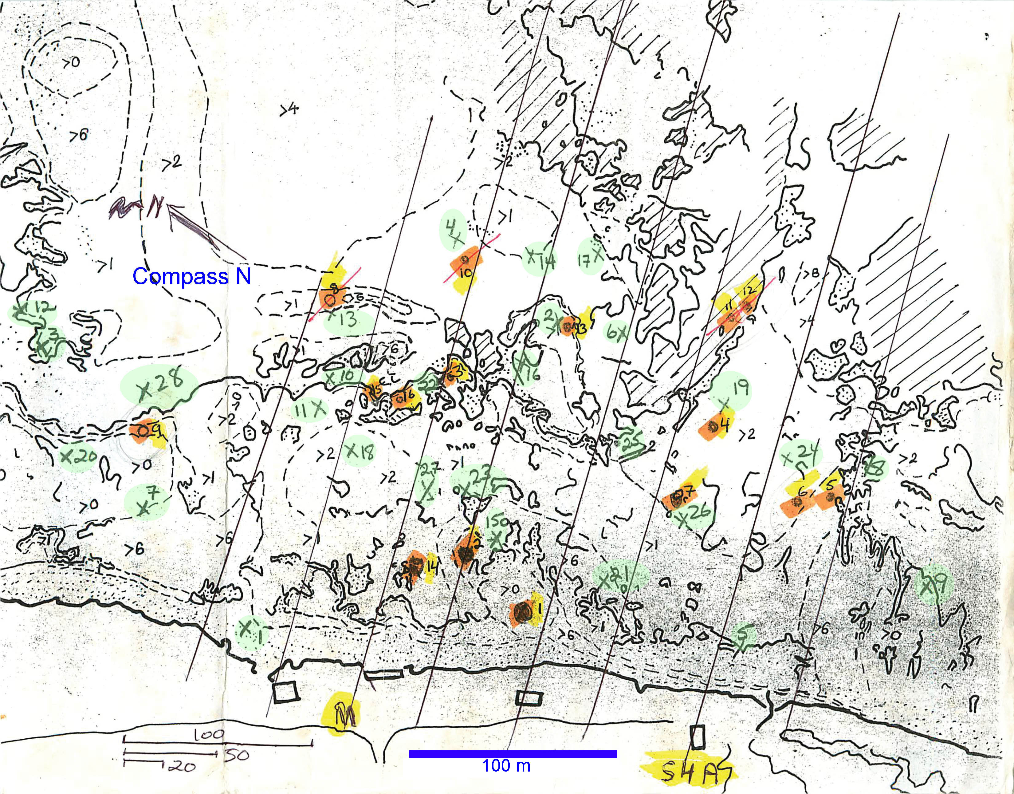 Working Map for Bath from 1969. “>X” refers to depths greater than X feet. Lines are transect lines. Green-highlighted numerals are the 28 random sampling points. Orange/yellow highlighted numerals are the 16 “stations”. “M”: Main Transect. “S4A” – 4th transect towards the south from the M transect. Scales at bottom left in yards, meter scale inserted. “Canada began its transition to the metric system (SI) in 1970, with the process largely taking place netween 1975 and 1985. Key milestones included the introduction of Celsius in April 1975, followed by road signs and gasoline sales in the late 1970s, creating a hybrid system still used today” (From Google AI)