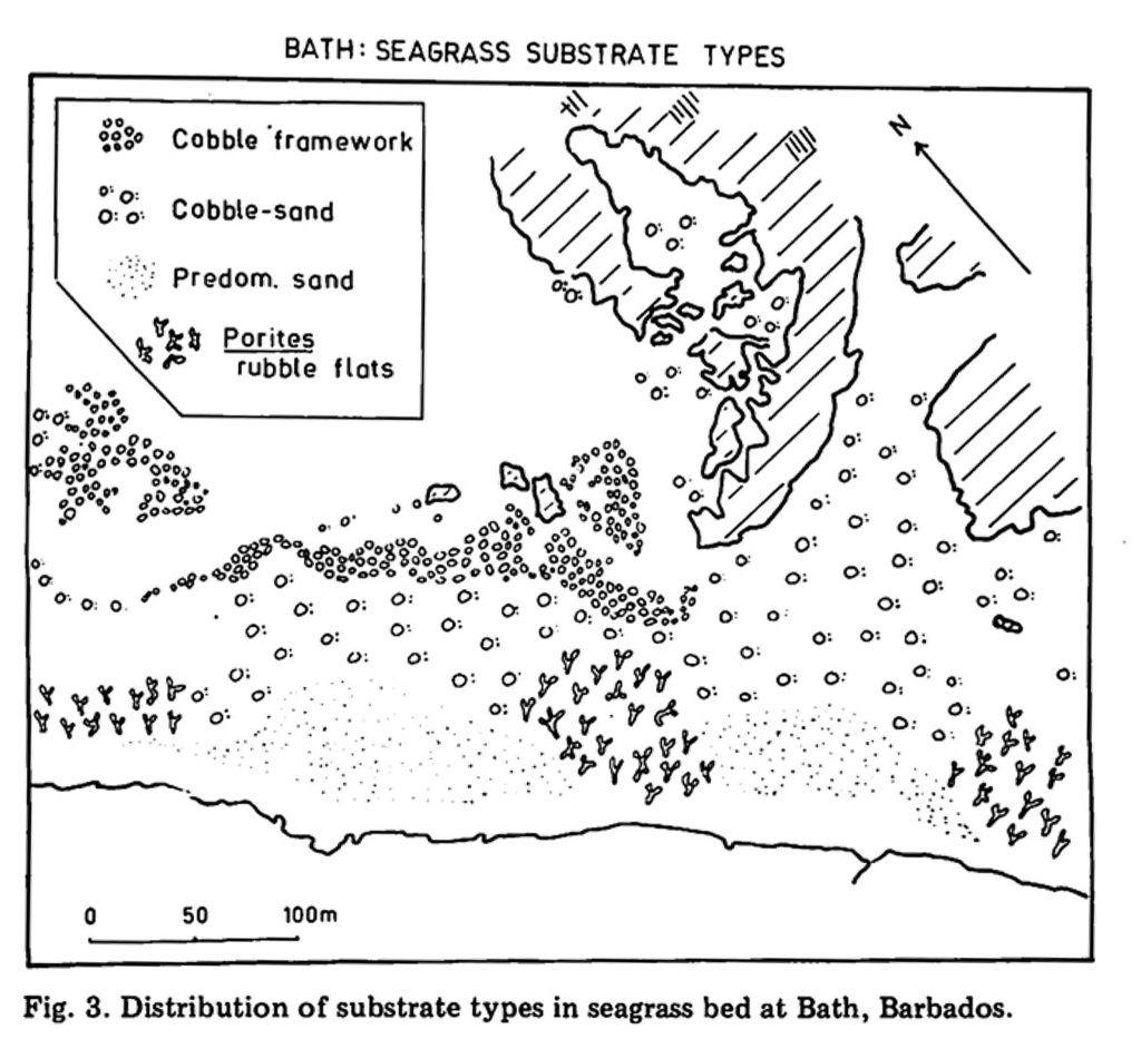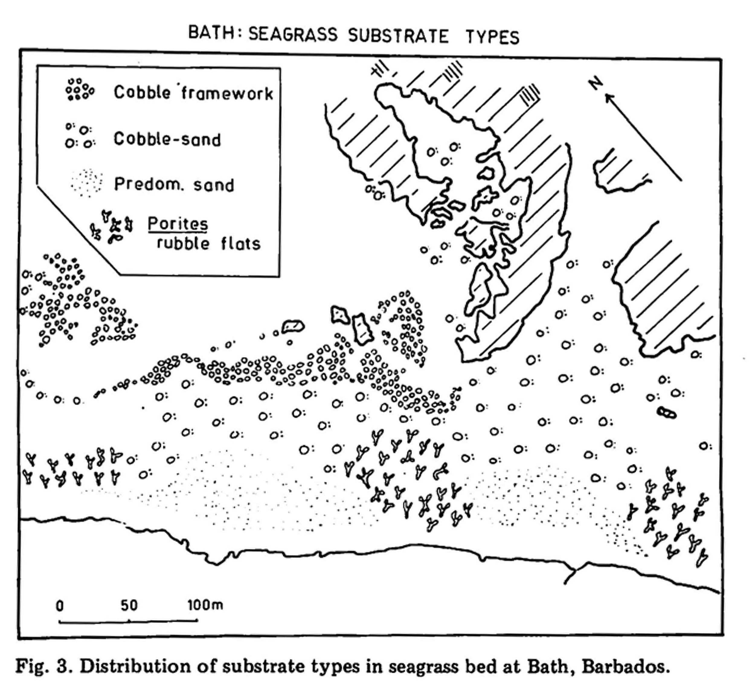 Seagrasses at Bath, including Thalassia testudinum, Syringodium filiforme and Halodule sp., lie partially in the lee of algal- and coral-encrusted rocks lying about 300 m offshore (Fig. 2).