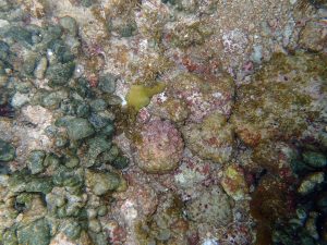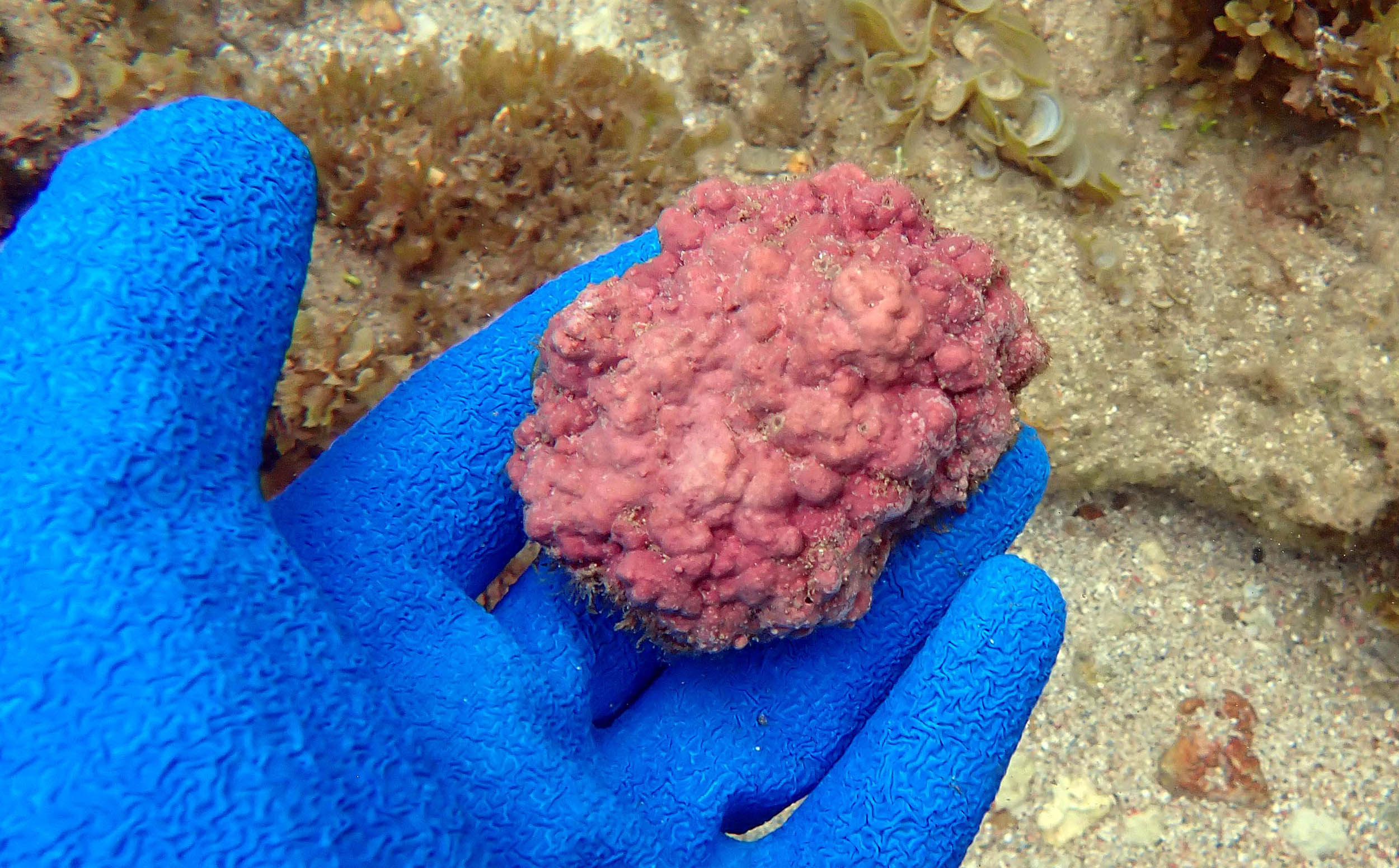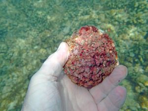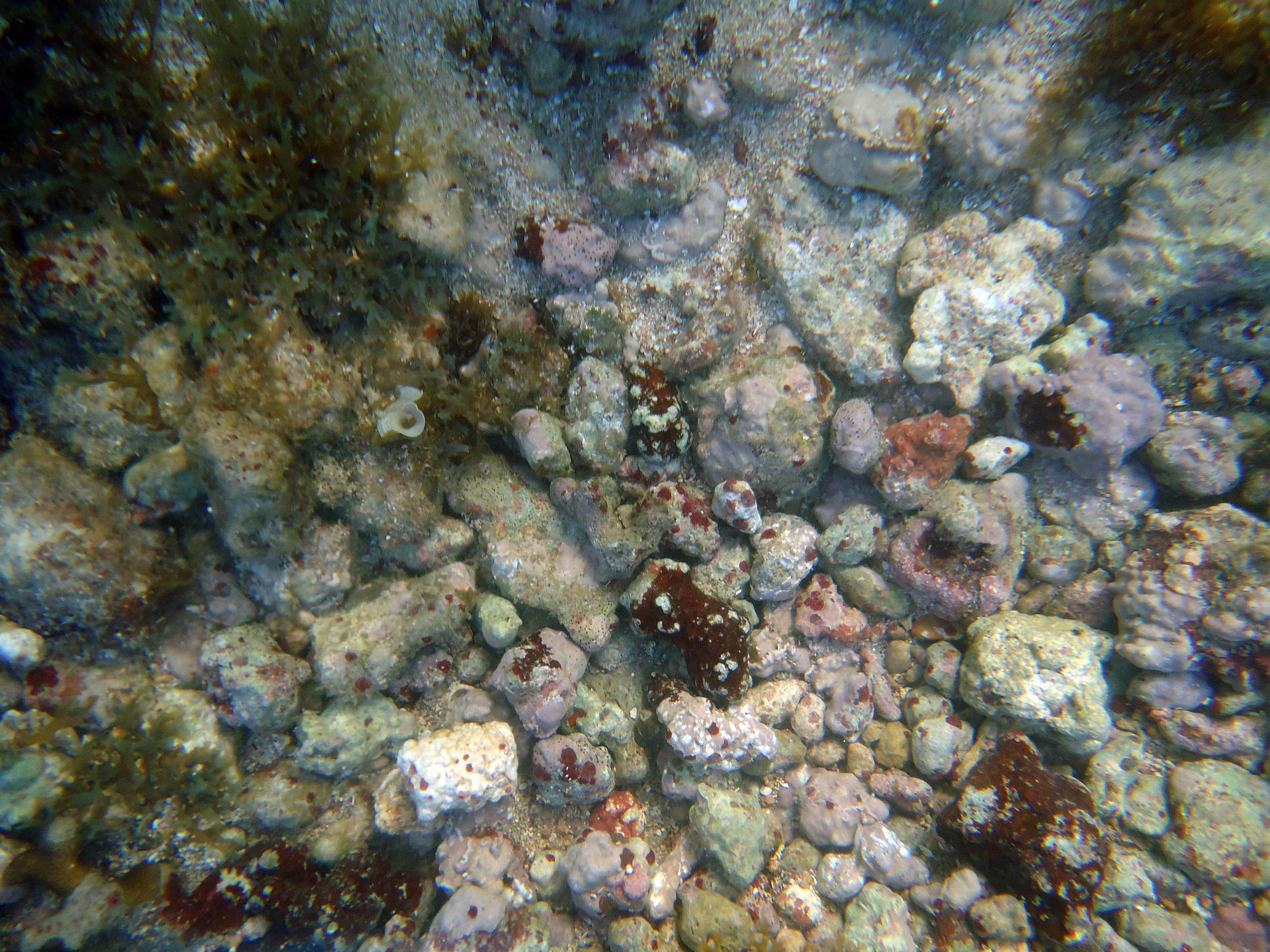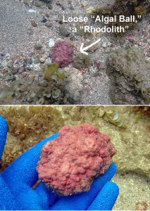 Pic I. Rhodolith on hard bottom/loose, coarse sand just inside “The Platform”, Mar 28, 2024. View iNat Record