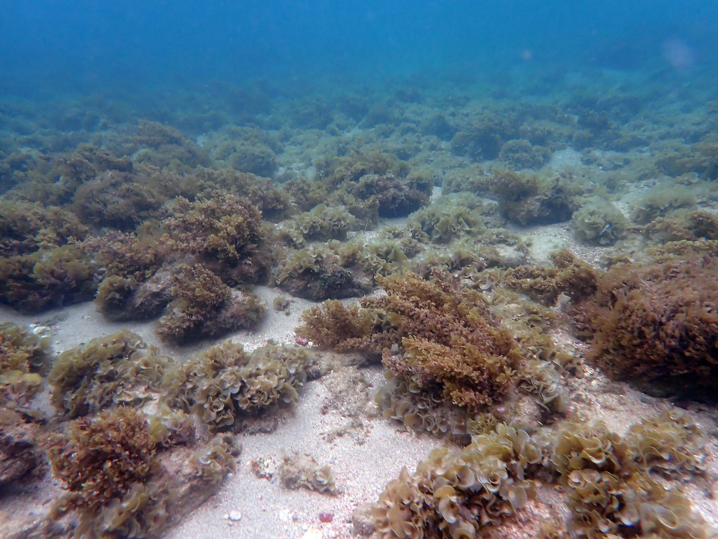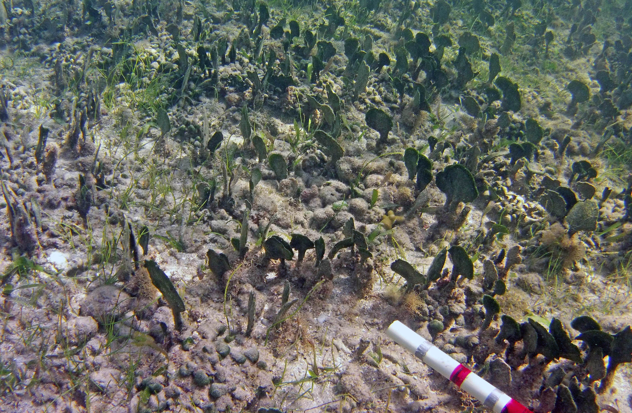 Pic XXII. Approx 100 m from shore on Transect M in 2015, area of dense Avrainvillea spp, note rubble mostly heavily colonized by sand-trapping epiphytes; also view Pic XV above.