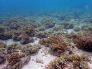 An additional factor, beginning in 2011, the east and south coasts of Barbados have been subject to massive seasonal influxes of Sargassum weed (REF). At Bath, thick mats of floating Sargassum weed sit over much of the lagoon area greatly reducing light penetration, and their decomposition releases nutrients that stimulate planktonic algae blooms and probably soluble compounds that reduce water clarity – see Sargassum weed (this website). I have noted heavy colonization of Avrainvillia spp. and exposed surfaces of stabilized rhodoliths by epiphytic algae in some of these areas (Pic XVII at left).