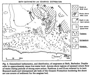 There are not detailed observations for Bath, but Nurse (1989) remarks that “an apparently powerful backwash carried much sediment seaward” which is consistent with the observations cited by the Bath resident that large amounts of rubble’ materials were washed onto shore one day and carried out to sea the next.