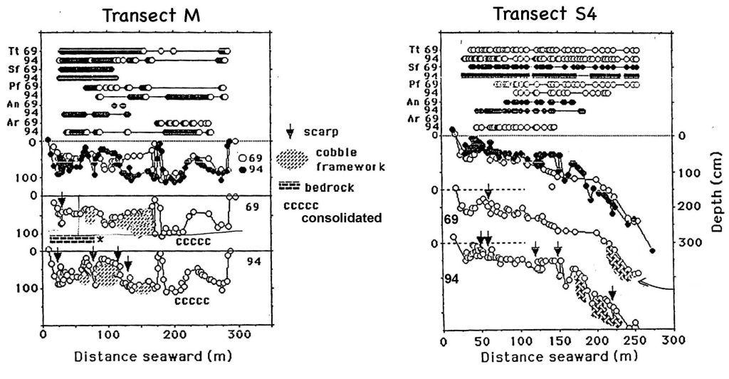 In 1994, the Cobble Framework accumulations had largely disappeared from the seaward fringe of Transect M, the depth increased and the continuous seagrass cover of that area was broken up into patches (Fig. 3, M: compare profiles for 1969 and 1994 at 120 to 170 m; hatching shows the volume lost 1969 to 1994).