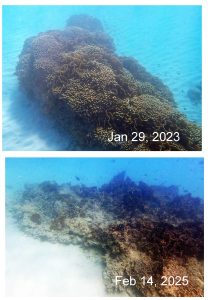 – Stinging Corals There continued to be very little recovery or survival of Millepora complanata following the extensive die-off and overgrowth by epiphytes (algae, fungi) observed in 2024 and attributed to extreme heating events in 2023, such events perhaps ongoing. The dead colonies appeared darker and to support lower levels and diversity of associated life. There were occasional living colonies, some young in appearance. There were fewer living M. alcicornis than I had noted in 2024.