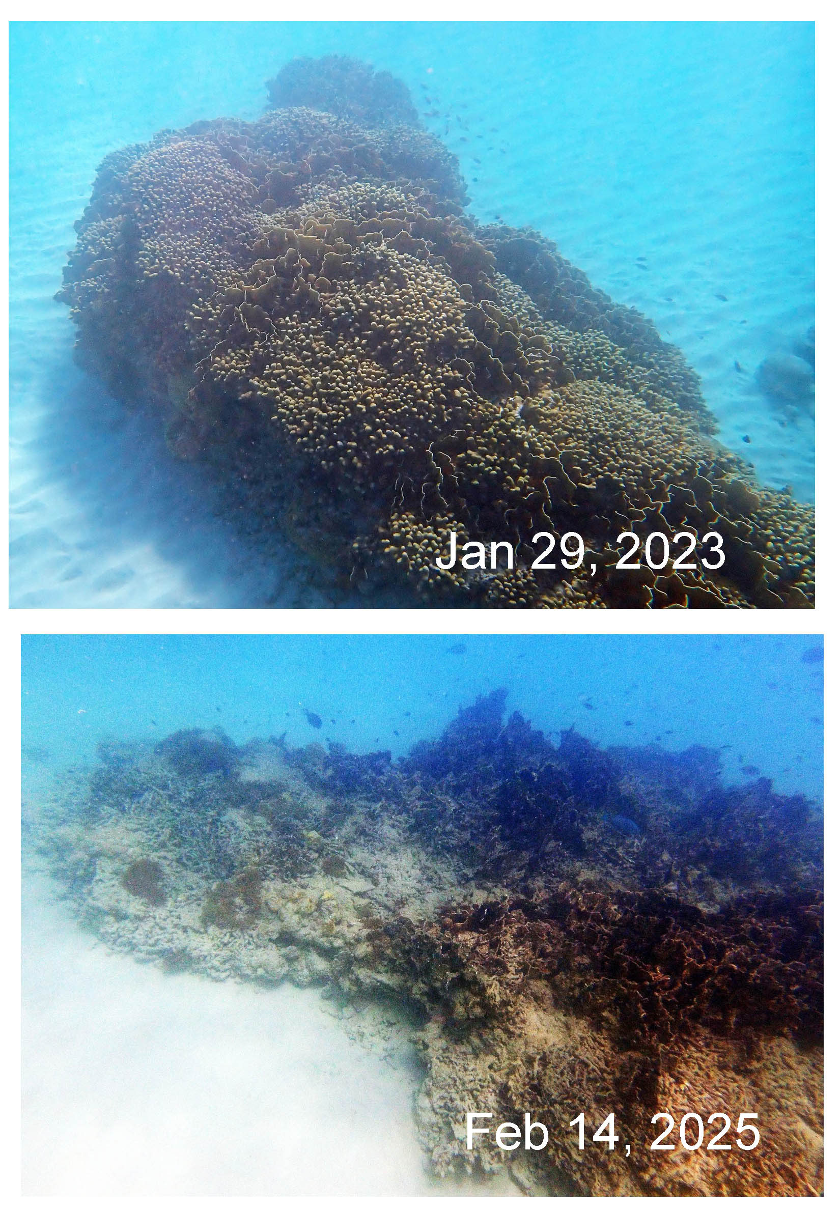 Right Bottom: Tip of spur (likely same spur; same area) in early 2025. Finger and pencil corals totally disrupted. Living coral cover <10%.