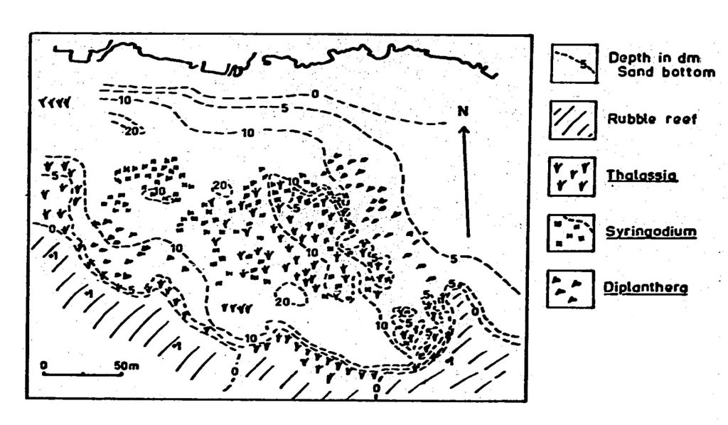- An overgrazing event was observed at this bed in 1969 after the survey was conducted. In September, large aggregations of sea urchins moved onto the bed from its seawardface, apparently originating seaward of the rubble bank (Fig). They were clustered one on top of the other and initially moved across the bed in one large aggregation with a distinct front. As the canopy was destroyed, wave action increased and urchins were washed further into the bed by wave action. Lilly (1975) studied growth of sea urchins during the event.He noted that “growth was rapid until November, 1969, when signs of overgrazing were first seen. By December all Thalassia blades were reduced to stubble…In March, the urchins appeared to be less numerous and the Thalassia blades were somewhat longer.” When D.P. last observed the bed, in February 1970, counts in 8 one-quarter m2 quadrats indicated an average of 4.5 seaurchins per m2 and the adjacent beach areas were littered with sea.urchins tests. The canopy cover had been completely removed, and the bottom had wave ripples similar to those in completely grass free area (photo). A small reef-like mound dominated by Porites porites and sponges at the seaward face of the bed had been complete dispersed.We did not observe outbreak of sea urchins in 1994, however in Brigitta I. van Tussenbroek et al., 2014, co-author HA Oxenford apparently provided info on occurrence “a population explosion sea urchins” in the monitoring interval (04/1993 to 09/2001):