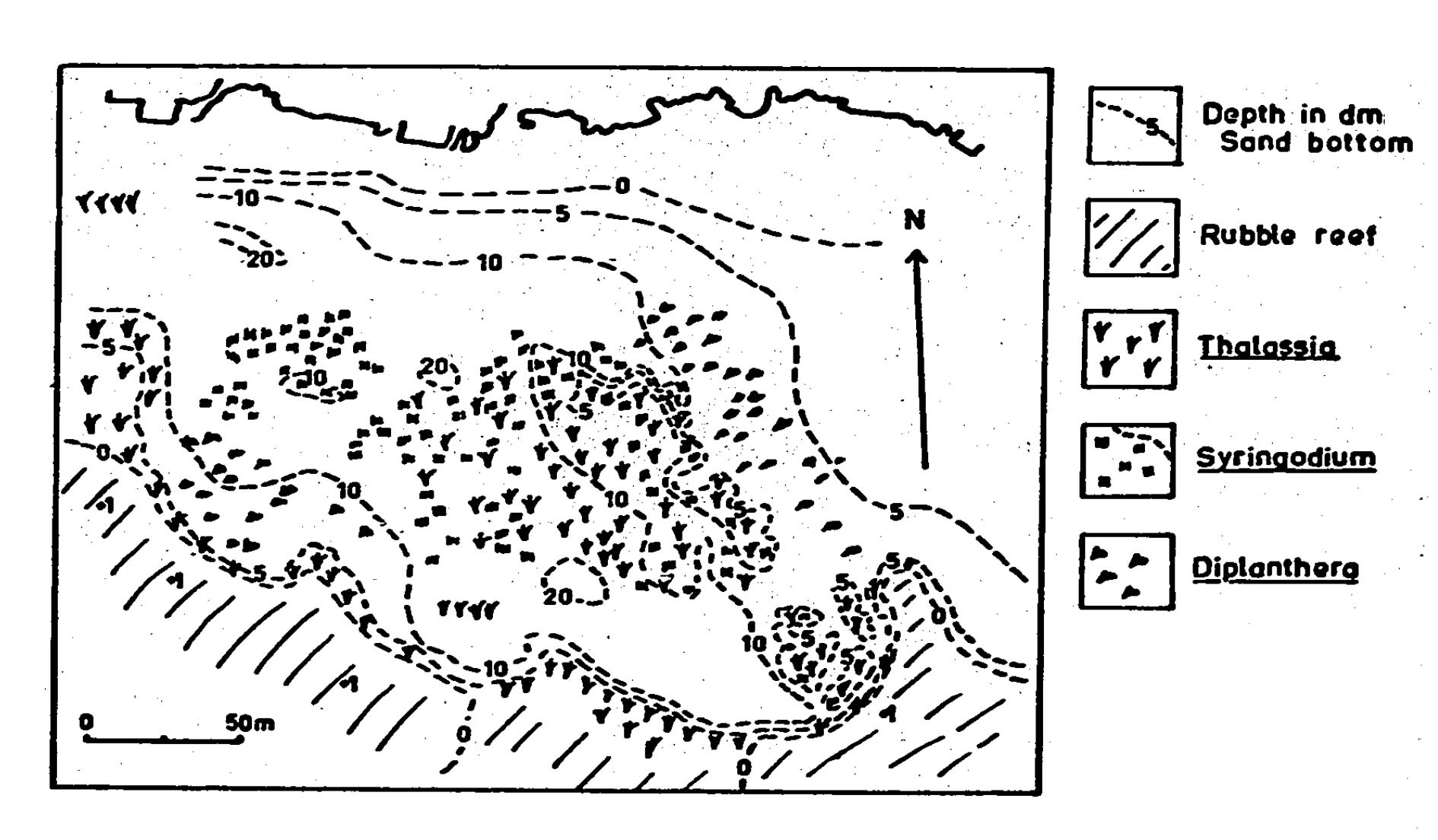 — Overgrazing of the seagrass bed by sea urchins: The 1969/70 event was similar to one described by Camp et al., 1973. Outbreaks of this intensity have not been reported for Barbados subsequently. Recovery was not subsequently monitored, however diagrams of marine vegetation cover taken from aerial photographs in 1973 indicate very sparse growth of seagrasses in the area of the study bed in contrast to comparison that author made with 1950 (XXX., 19XX). Sea urchins can keep patches within seagrass beds free of seagrass if high densities (>20m-2 for Lytechinus variegatus) are maintained (Valentine and Heck, 1991). However, this could not be a mechanism for maintenance of reduced area at St. Lawrence as sea urchins are harvested as delicacy in Barbados, and such densities were certainly not retained; few were observed in 1994.