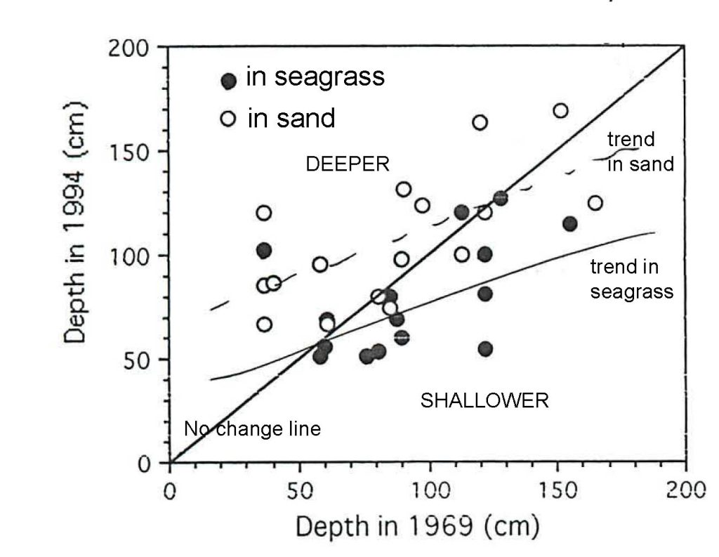 - In 1994, bottom depth was significantly greater than in 1969 at sites where seagrass had been present in 1969 but was not present in 1994, while it was significantly less (shallower) where seagrass was present in both years. This suggests that much of the sand that became mobilized by erosion of seagrass bed, subsequently became trapped in seagrass remaining.
