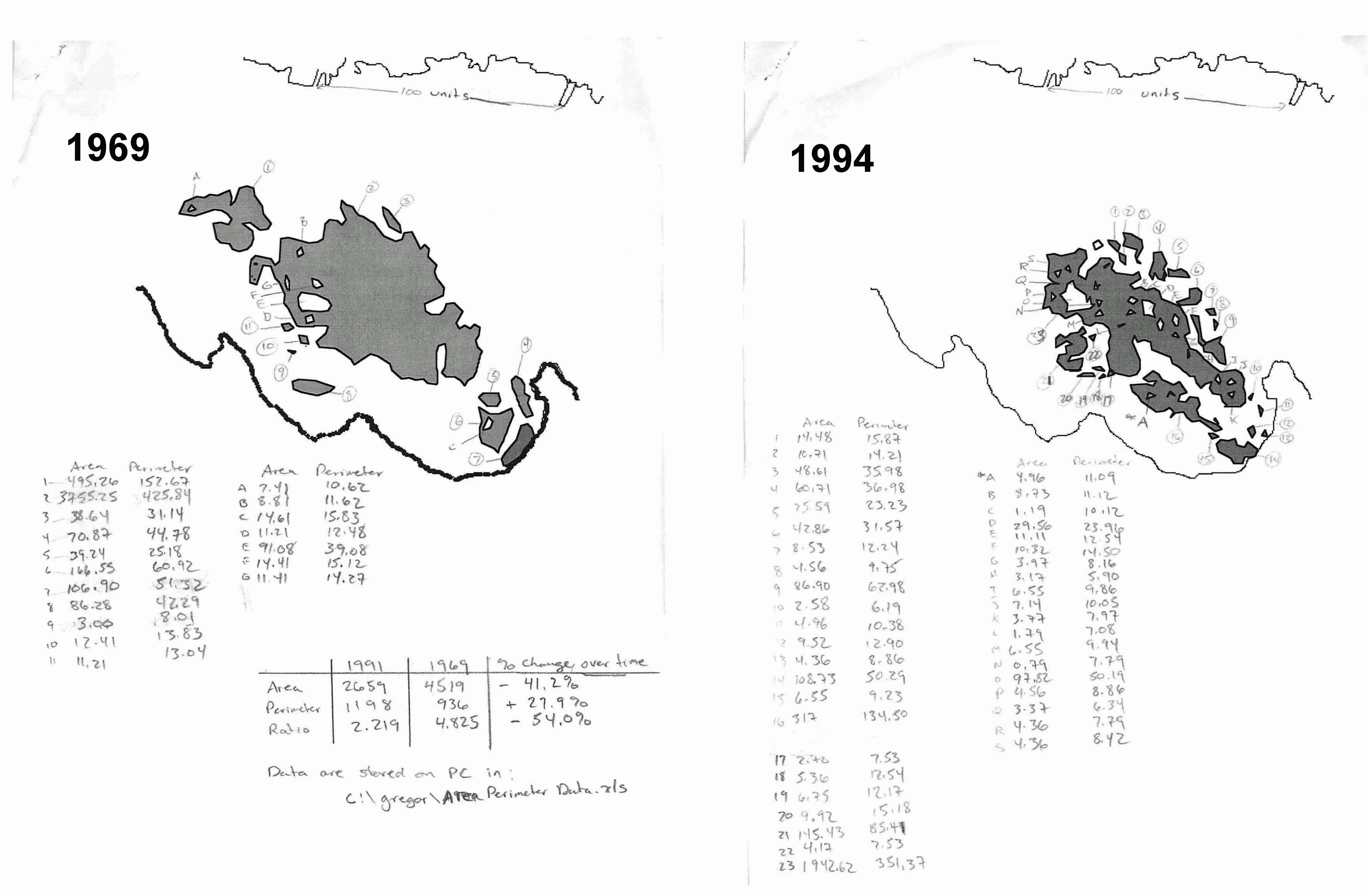 Fig SL-4. Map of seagrass area at St. Lawrence in 1969 and 1994. Pencilled in are calculations of the total area(s) and total length of the perimeter(s). Between 1969 and 1994, the total area decreased and the beds became more fragmented, resulting in a 54% decrease in the ratio of area to perimeter; there was more fargmentation and edge in 1994, increasing susceptibility to erosion.