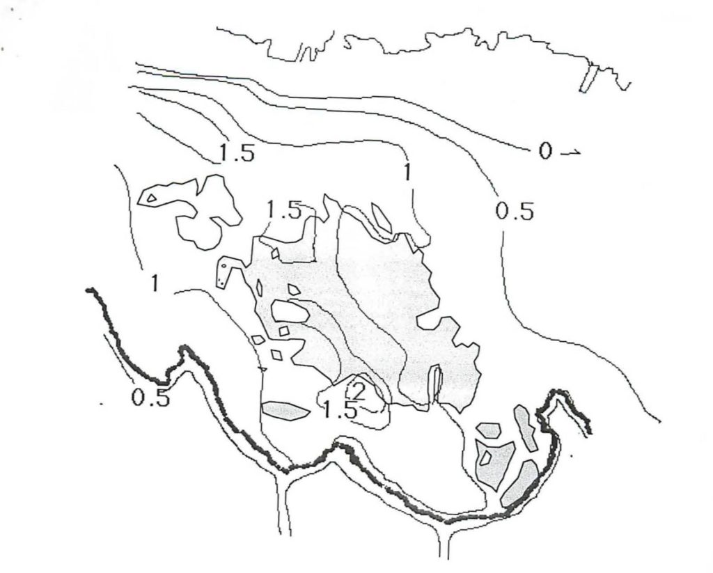These physical factors would seem sufficient to explain the changed state of the St. Lawrence bed. however, as at Bath, there have been other changes in the environment in the interim and these could have contributed to the changes in the seagrass bed. Nutrient loading at St. Lawrence increased between 1969 and 1994 (2.9 mg L-1 in 1997, 8.4 mg L-1 in 1992: Delan, 1995), and although not measured, growth of non-calcareous epiphtes was fairly heavy on the older parts of leaves of both T. Testudinum and S. filiforme in 1994, while it has not been noted as such in 1969. It is possible also that other contaminants in the marine environment caused more stress to the seagrasses in 1994 than in 1969.