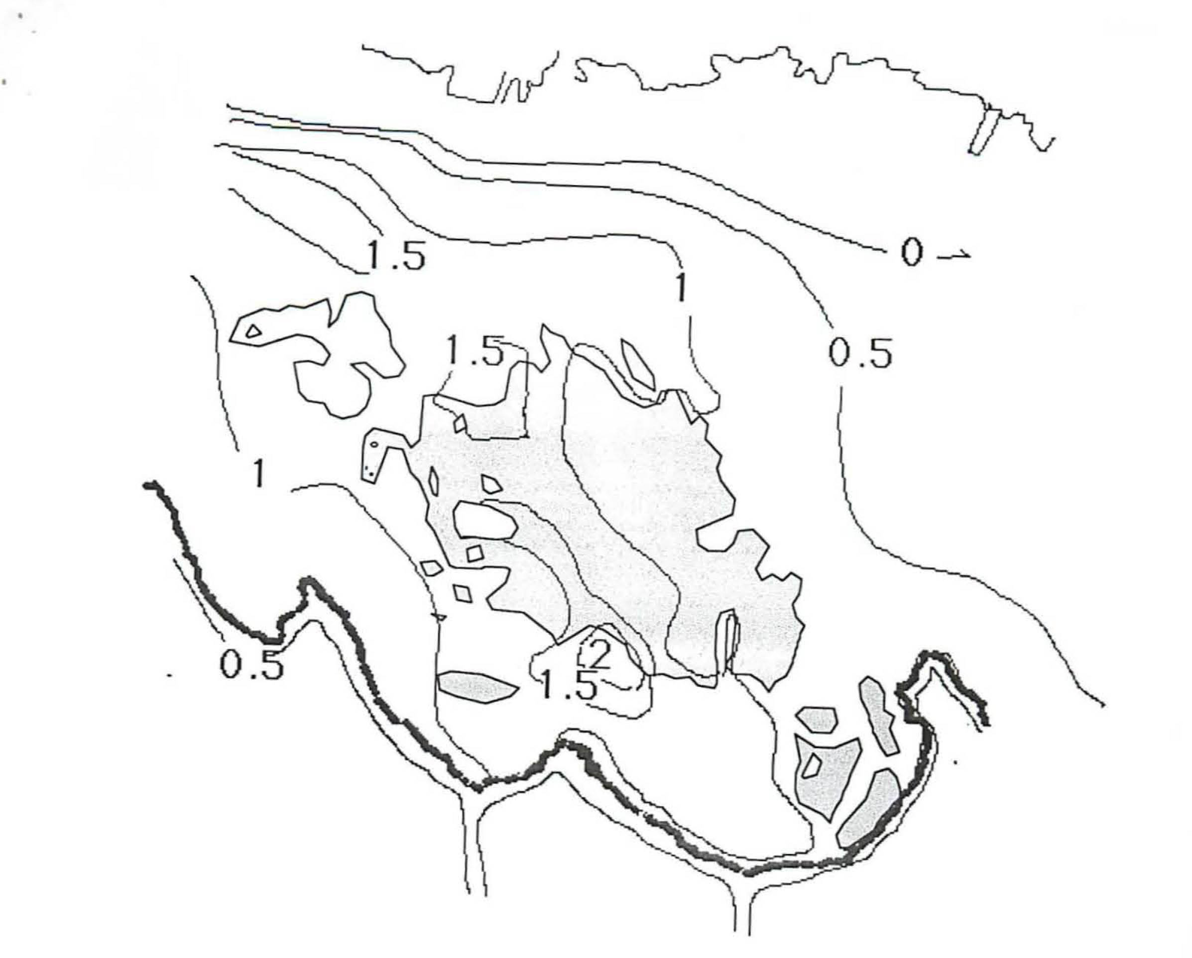— Increased transport of sand into the area. Construction of groins along this coast have increased the amount of sand. The depth data suggest that seagrass colonized areas were significantly shallower in 1994 than in 1969, and this was obvious to the senior author. Increased sediment transport into the area could be factor favoring S. filiforme over T. testudinum because of its above ground rhizomes and high growth rates of vertical shoots (ref); amongst 6 Philippine species. Thalassia hemprichii is most readily displaced by sediment burial (Duarte et al., 1997). However it seems unlikely that it would generate more áfragmentation of the bed. Lugo-Fernandez et al. (1994) reported that photographs taken 2 years before and 4 years after a severe hurricane on Mararita reef (Puerto Rico) indicate a elimination of Thalassia-Syringodium beds in an area where energy is most concentrated, but a corresponding increase in size in central and western areas where deposition of sediment would be expected. Sediment deposition seems to be most detrimental when it is episodic in nature and smothers beds for more than several months (Shepard et al., 1989; Duarte et al., 1997) or has a high content of silt and clay (Terrados et al., 1998). However, shallowing as at St. Lawrence could effect patch formation by bringing S. filiforme closed to exposing it to greater intensity of disturbance by waves, increasing the probability of disruption and formation of blowouts.