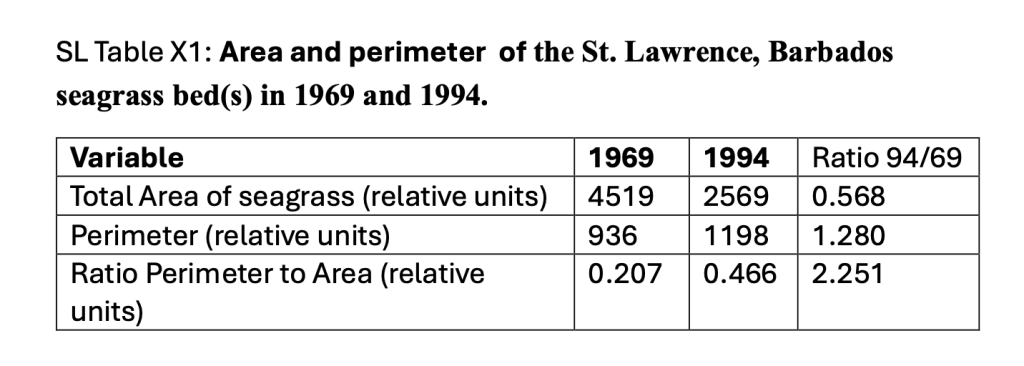 - Data from aerial photography and ground truthing indicated the seagrass bed area in 1994 was 57% of the area 1969 (SL Table X1). The seagrass bed(s) also became more fragmented (Fig SL-4) and the perimeter-to-area ratio of 1969 increased by a factor of 2.25 in 1994 (SL Table XI).