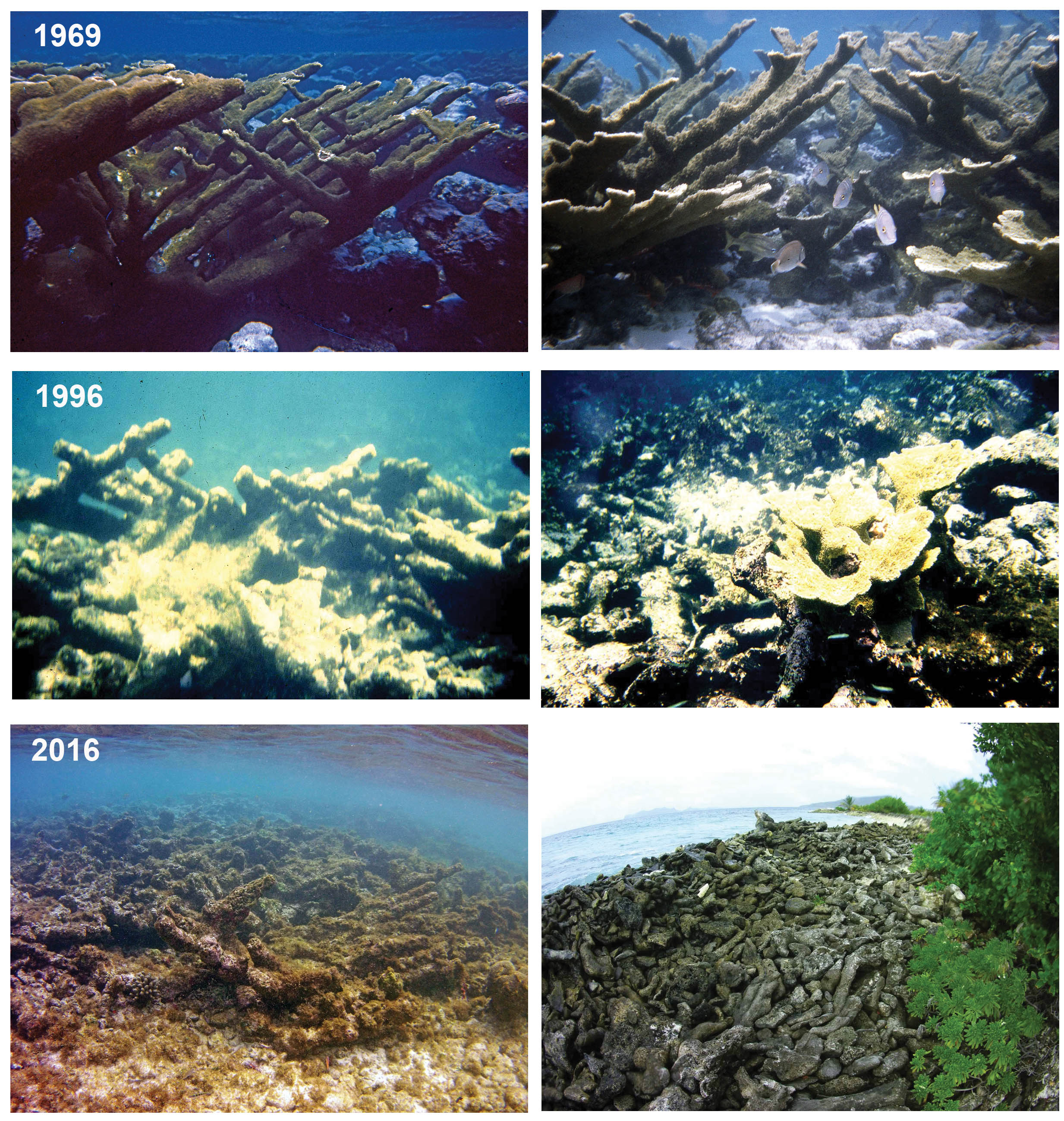 1969: Intact, living A. palmata reef. 1996: A. palmata entirely dead but mostly still in-place following die-off from White Band Disease in late 1970s/early 1980s; a few small colonies of a new generation of A. palmata were present. 2016: Original A. palmata framework reduced to rubble, no substantive replacement by newer colonies. (Photographs by David Patriquin.) For details of changes from 1969 to 1996, see Patriquin DG, Hunte W. Preliminary observations of the status of shallow water reefs at Sandy Island, Carriacou, Grenada. Report to the Grenada Board of Tourism and the Kido Project Environment Station, Carriacou. 1997. Available at: https://dalspace.library.dal.ca/handle/10222/82532.