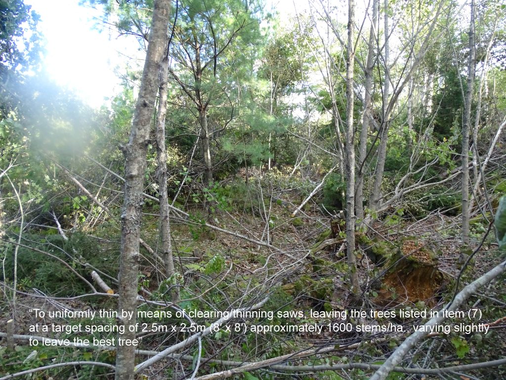 Specifications for Spacing/Thinning in Point Pleasant Park:1) To uniformly thin by means of clearing/thinning saws, leaving the trees listed in item (7) at a target spacing of 2.5m x 2.5m (8′ x 8′) approximately 1600 stems/ha., varying slightly to leave the best tree.