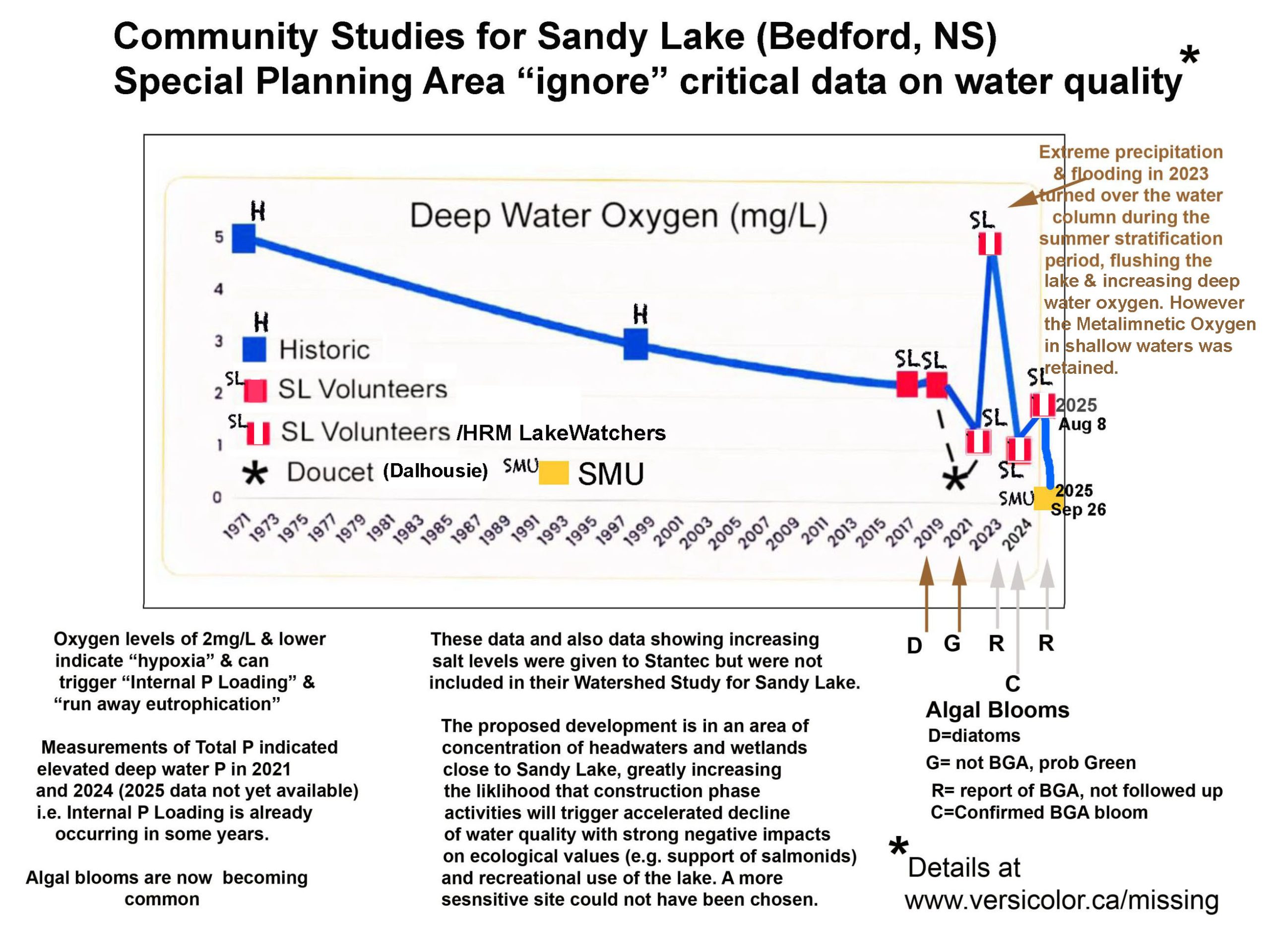 Update Nov 13, 2025: For the SL Volunteer observations, I modified the symbols to show which observations were conducted in collaboration with and according to the protocols of the HRM LakeWatchers Porgram. That followed a discussion with a Clayton Developments rep. at the open house in which he expressed concerns about our methodology and commented that their own observations have not shown similar low oxygen values. Note that all of the low oxygen values were observed by academic researchers or by Sandy Lake Volunteers in collaboration with the Halifax LakeWatchers program. The anomalously high value in 2023 occurred following heavy precipitation/flooding which disrupted the summer stratification; the values dipped again the next year. Even in 2023, the peculiar “Metalimnetic Oxygen Minimum” in shallower waters was retained, and was recorded (but not commented on) by Stantec in their Watershed Report – see Comments Doc, Fig 1, page 3, and Section 5B, pages 13-15