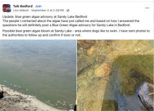 Sandy Lake was listed on the NS Gov.’s Blue-green algae webpage as a site of a potential BGA (Blue-green algae) bloom earlier this month. That post followed a report with photos sent to the provincial government, and posted by Lisa Abbot on the public Facebook Page “Talk Bedford” on Sep 2, 2025.