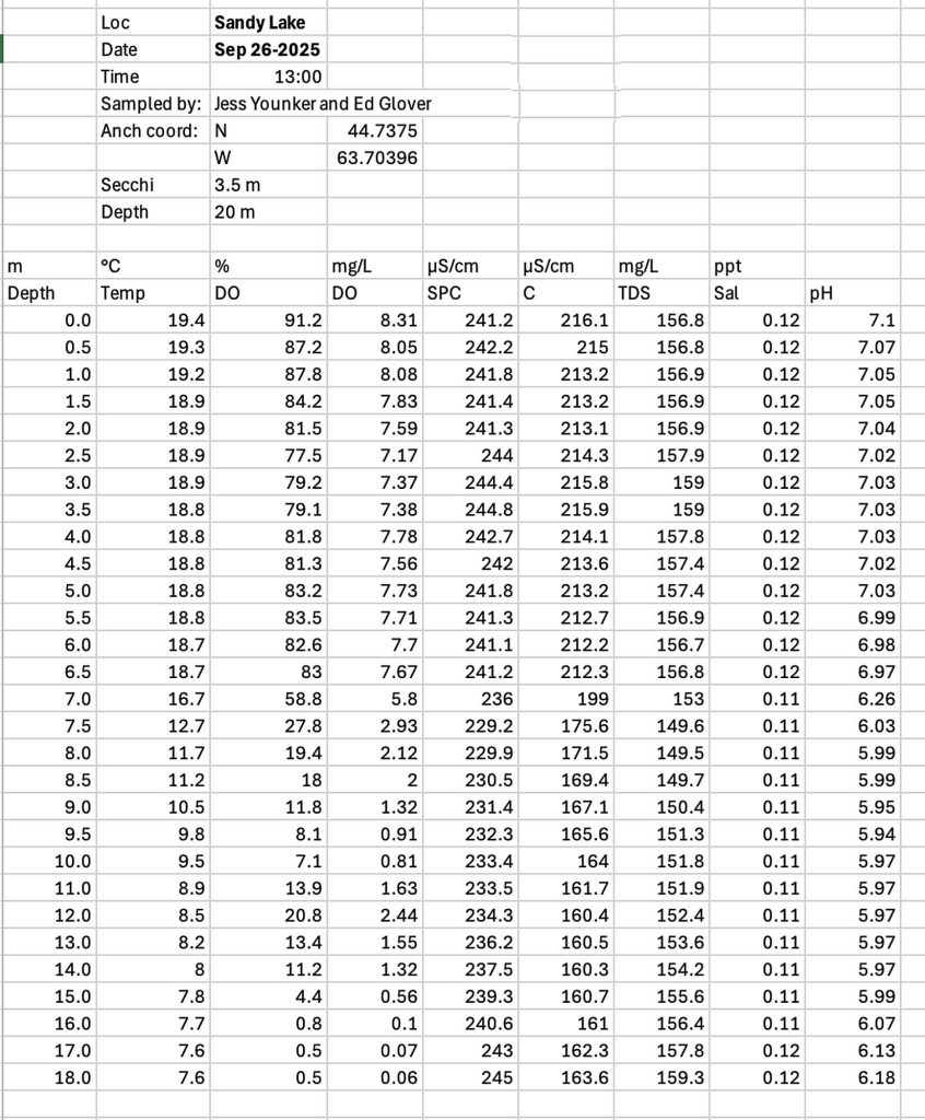 – see Identifying lake water quality trends and effective monitoring strategies in a rapidly urbanizing region by Casey Doucet. Master of Applied Science thesis 2022-12-08, Dalhousie University; and Fig B1 supplement. The Fig for Sandy Lake in the supplement shows Temperature, Dissolved Oxygem (mg/L) and Total P(ug/L) down to approx 19 m. The oxygen profiles exhibits a curious decline in the area of the thermocline with a min value circa 3 mg/l at approx. 6 m; it then increases to close to 5 mg/L at about 8 m, and then declines gradually until 15 m and then sharply between 15 and 19 m reaching a minimum of approx. 0.4 mg/L in the deepest sample at approx. 19 m. (We observed A similar decline of oxygen in the thermocline area in out August 2022 sampling shown below). The Total P sampled at 5 points only (approx.  0, 3, 7, 10 and 18 m is close to 10 ug/L for 0 to 10 m and increases from approx 10 ug/L at 10 m to approx. 22 ug/L at 18 m, suggesting some mobilization of P stimulated by anoxia in the bottom sediments,