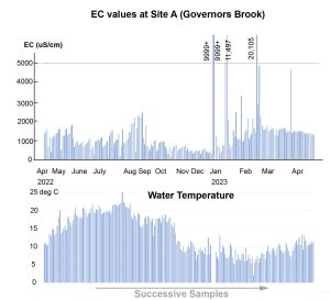 “Full strength seawater is about 50,000 uS/cm. So water in Governors Brook on the high EC days (Fig 1) was the equivalent of about 20-40% seawater. The Canadian Water Quality Guidelines for the Protection of Aquatic Life for chloride are 120 mg CL/L for Long term Exposure and 640 mg CL/L for short term exposure; the equivalent EC values are 474 and 2414 uS/cm respectively (source). On the days when EC exceeded 9,999 uS/cm, the chloride values were likely at least 5 x the critical value for short term exposure!”