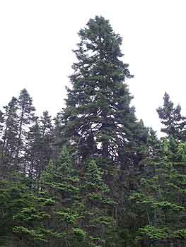 ![]() Large red spruce on slope to lake |