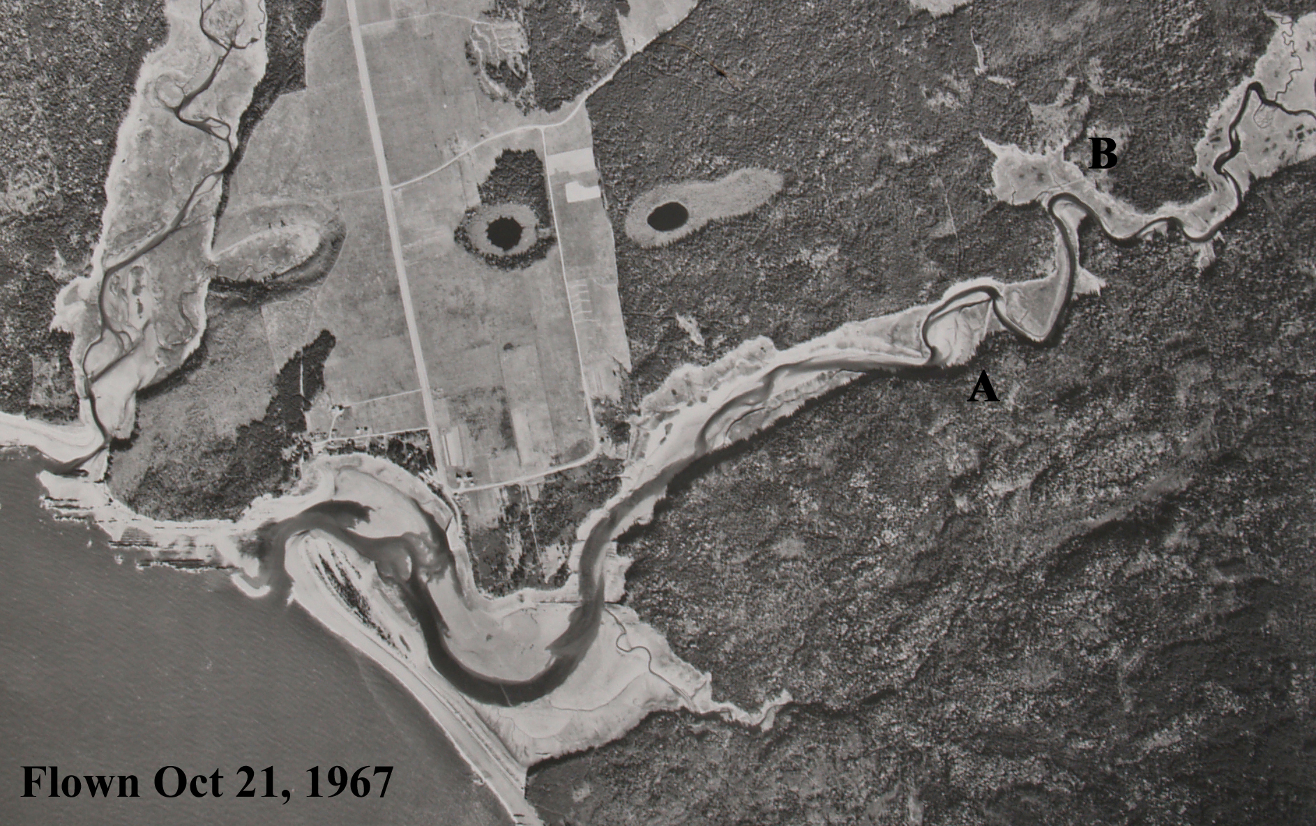 The aerial photograph shows two dykes on the Diligent River. One dyke runs across the river at point A and the other dyke, located at
