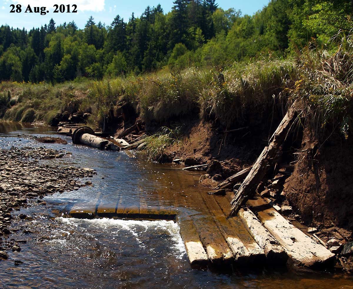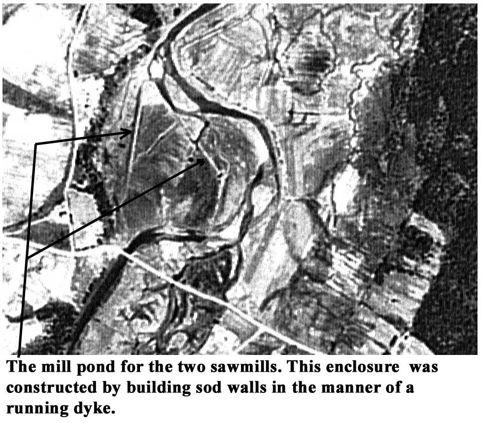 The sites once occupied by the two adjacent saw mills have been marked by hand.