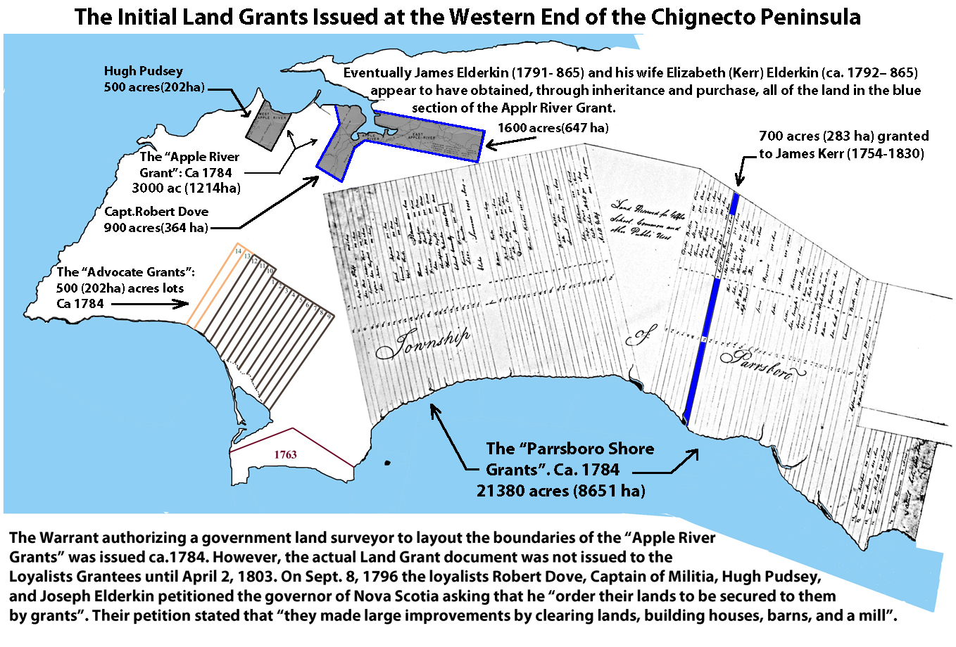 The Loyalists Robert Dove, Captain of Militia, Hugh Pudsey, and Joseph Elderkin, for example, arrived on their Apple River grant shortly after it was issued in