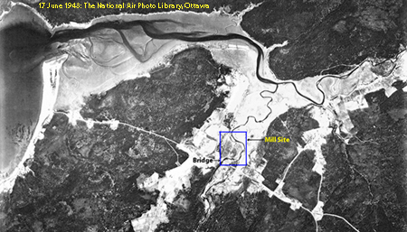 The steam mill replaced the water mill around 1878. Both mills are slowly emerging from an eroding river bank located on a bend in the river.
