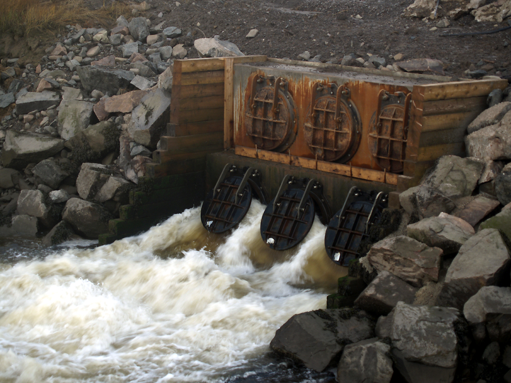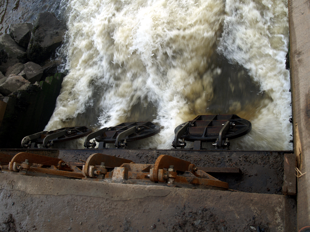 Dyked salt marshes required sluiceways with tide operated one-way valves to prevent seawater from inundating the marsh at high tide. Tide operated sluiceways, called aboiteaus by the Acadians, aboteau in France before the colonization of Acadia (Hatvany 2002, p.124), and tide gate in England and the United States, were used in Roman settlements in the Netherlands in the first century AD (Rippon 2000, p. 84-90). The image links below show a Roman aboiteau and a present day aboiteau.