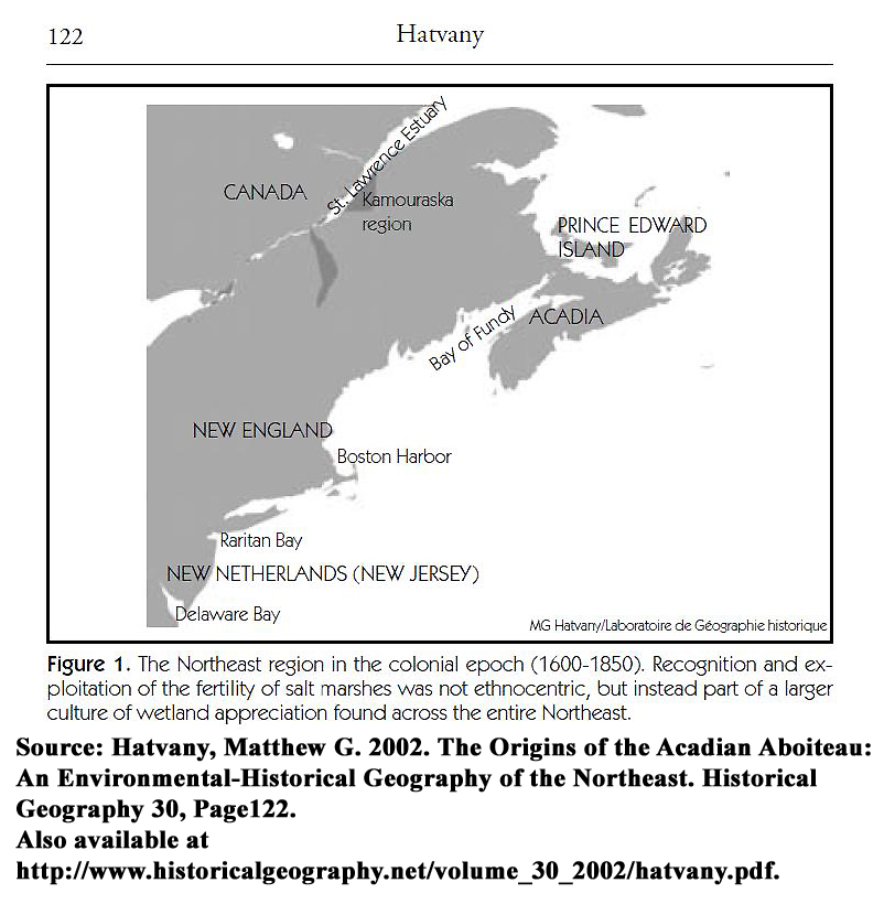 Hatvany, Matthew G. 2002. The Origins of the Acadian Aboiteau: An Environmental-Historical Geography of the Northeast. Historical Geography 30, Also available at http://www.historical-geography.net/volume_30_2002/hatvany.pdf.