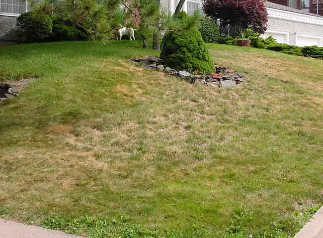 The photographs illustrate similar slope situations (angle of slope, exposure to sun) in the same neighborhood on September 3 after a long droughty period. Top: without clover (likely infested with chinch bug ); bottom: with clover. The grass-clover turf maintained its greenness and there is no evidence of chinch bug damage. |