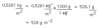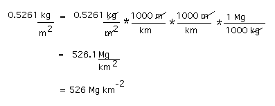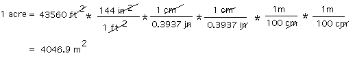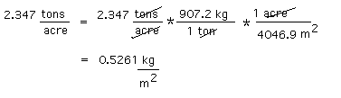 | Problem: To convert 2.347 tons/acre to SI units with 3 significant digits given 1 acre = 43560 square feetBelow, I have shown how I (dp) would do the conversion. It is described in 6 steps. Step 1. First, I determine the pertinent SI base units: The SI unit for length is the meter (m) and the derived unit for area is the square meter (m2). Step 2. I do a calculation to find out how many kilograms are in a U.S. ton: ![]() I was not given how many kilograms there are in a ton, but I was given the information that 1 U.S. ton contains 2000 lbs and that 1 lb is equivalent to 0.4536 kg. So I multiplied 2000 lbs by an equivalency factor (0.4536 kg/1 lb). An equivalency factor gives the number of one unit in the numerator, and the equivalent number of another unit in the denominator. Which unit goes in the numerator and which goes in denominator depends on what is being converted to what. In this case I put the lb unit in the denominator because I wanted it to cancel out the lb unit in the expression "2000 lb". If instead of being given 1 pound (lb) = 0.4536 kg, I had been given 1 kg = 2.205 lb, the equivalency factor would have been (1kg/2.205 lb); the result would be the same. Step 3. I do a calculation to find out how many square meters there are in 1 acre: ![]() Then I converted square inches to square centimeters using the equivalency factor (1 cm/0.3937 in) squared. (If I had been given 1 inch = 2.54 cm, the equivalency factor would be 2.54 cm/1 inch; the result would be the same.) Finally I converted square centimeters to square meters by multiplying by (1 m/100 cm) squared. I cancelled out units as I added equivalency factors. If the calculation was set up correctly, the units that do not cancel out in the end will be the units I want (m2). If it wasn't set up correctly e.g., I multiplied by ft2/in2, rather than in2/ft2, I wouldn't end up with the units I want and I would know that I had made an error. Once I confirmed that the units were the ones I wanted, I multiplied the numbers with a calculator to give me the numerical part of the answer (4046.9). Step 4. Now I convert 2.347 tons/acre to units of kg/m2 using the numbers I came up with in (2) and (3) above to make the appropriate equivalency factors: ![]() Step 5. I want the number before the units to be between 1 and 999 rather than a smaller or larger number, so I convert kilograms to grams and then round the number off to 3 significant digits. ![]() Step 6. I might prefer units that express the yield per square kilometer rather than per square meter; converting the yield from g/m2 to Mg/km2 results in a number between 1 and 999. (Once you get used to the prefixes, it is easy to do such changes in your head). ![]() A quicker way of doing it: I could look on the web for a single factor for converting tons/acre to grams/m2, for example at A DICTIONARY OF UNITS. It turns out they do not provide this factor, however, they do provide factors for converting tons to kilograms (1 ton = 907.2 kg) and acres to square meters (4047 square meters in 1 acre). With those numbers in hand, I could proceed directly to step 4.